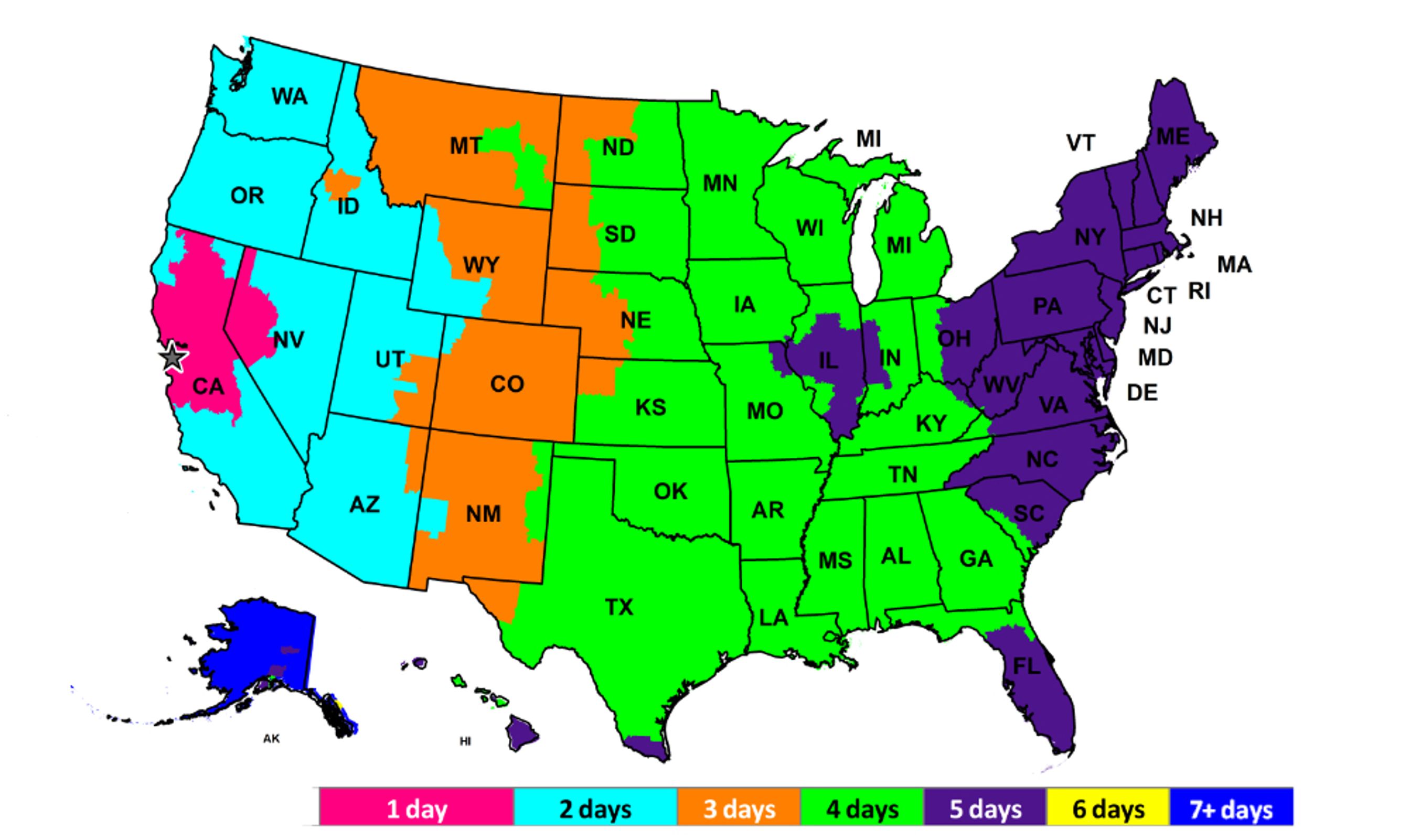 See the map below for estimated shipping times across the United States. International shipping times can vary greatly depending on location, so please contact us for more information.